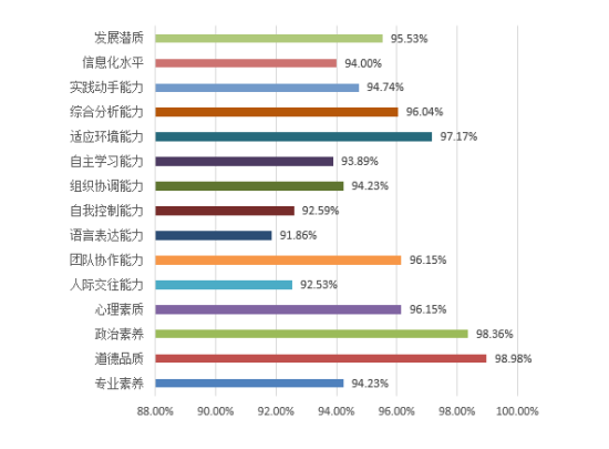 另外,问卷从15个指标角度调查了受访学生对于自身成长的满意度。调查结果显示,所有指标的满意度均超过了90%。其中,受访者对于自身道德品质、政治素养、适应环境能力的满意度位列前三。数据深刻体现了我校立德树人的工作成果,学生的思想政治建设和文明修养提升卓有成效。