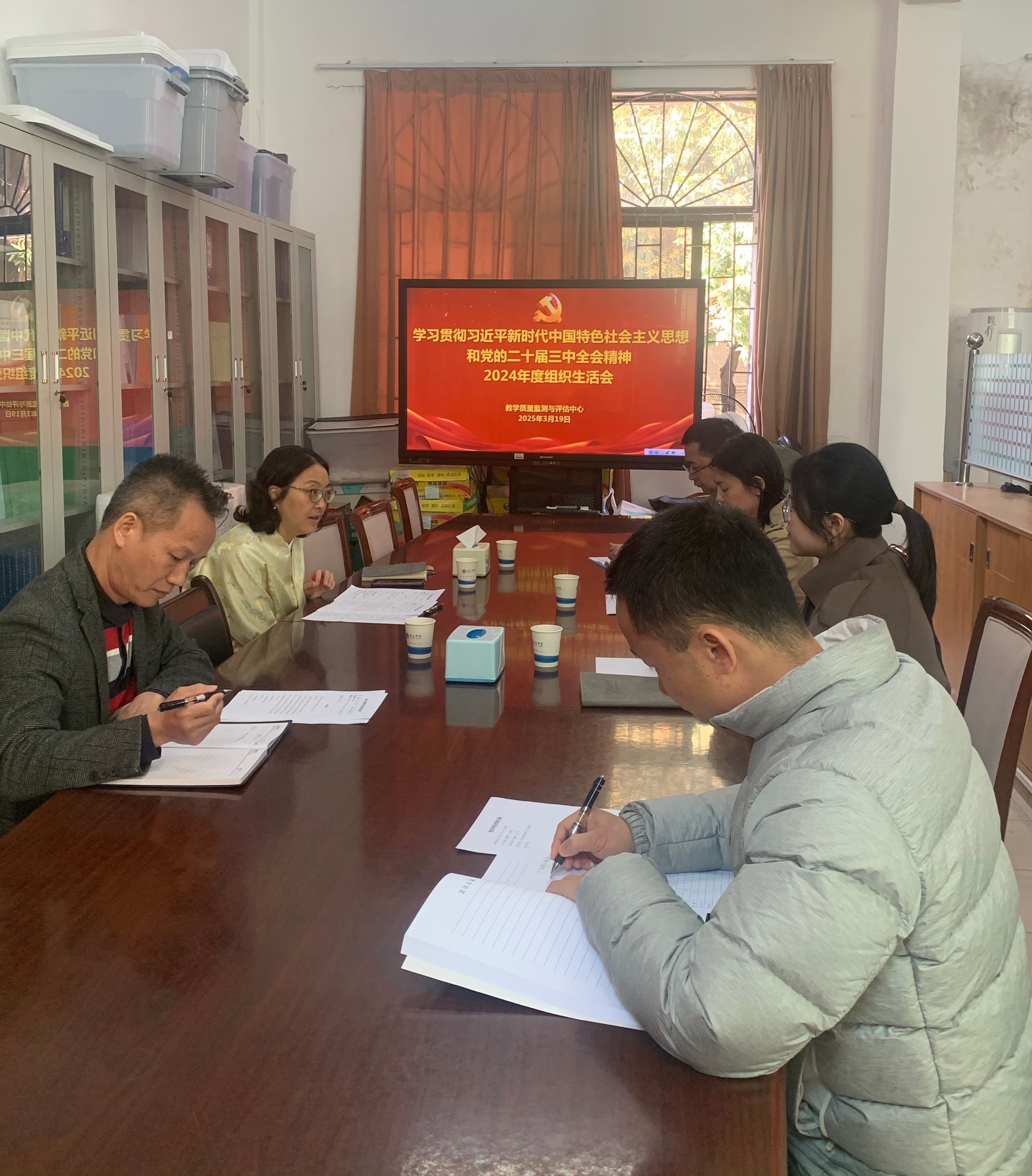 2025年3月19日上午,教学质量监测与评估中心党支部在行政楼124室召开2024年度组织生活会及民主评议党员大会。会议由党支部书记李佩环同志主持,全体党员及入党积极分子参加了此次会议。