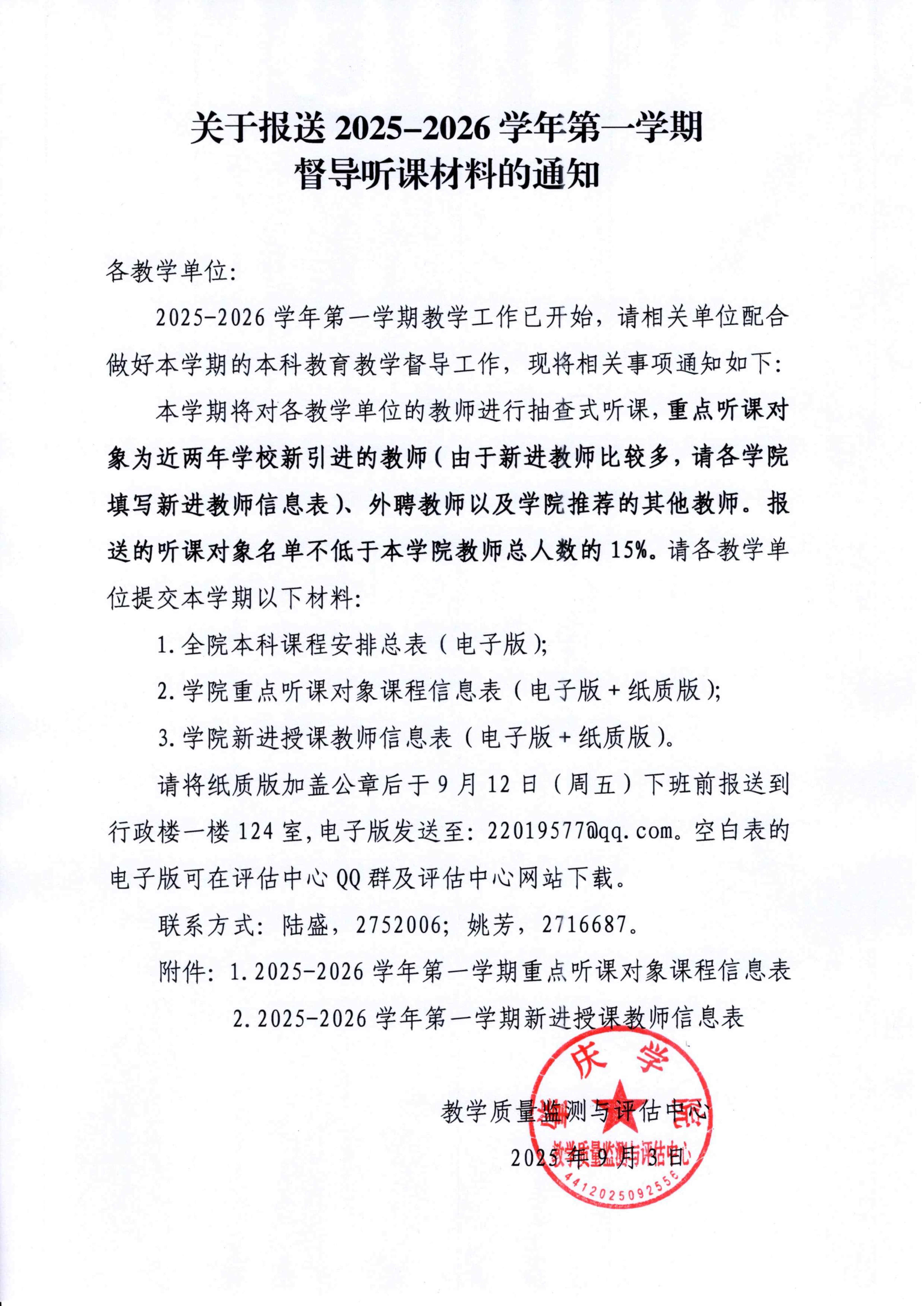 关于报送2025-2026学年第一学期督导听课材料的通知