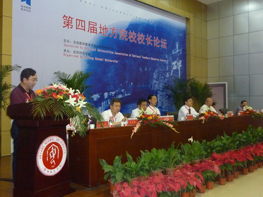 6月25—28日,主题为“规划·特色·发展”的第四届地方院校校长论坛在河南省安阳师范学院隆重召开,来自全国25个省市区的90所院校的96名校长出席论坛,共商地方院校发展的宏伟蓝图。教育部师范教育司司长管培俊在论坛上作主题报告。他围绕国家中长期教育改革和发展规划纲要中有关教师教育的内容,从教师教育体制改革和教育学科的发展状况等方面对教师教育的形势作深刻分析,并给出明确的判断。他希望参加本届论坛的地方院校敢于担当责任、准确定位,不断加强学科建设和人才队伍培养,为科教兴国、人才强国战略作出更大贡献。