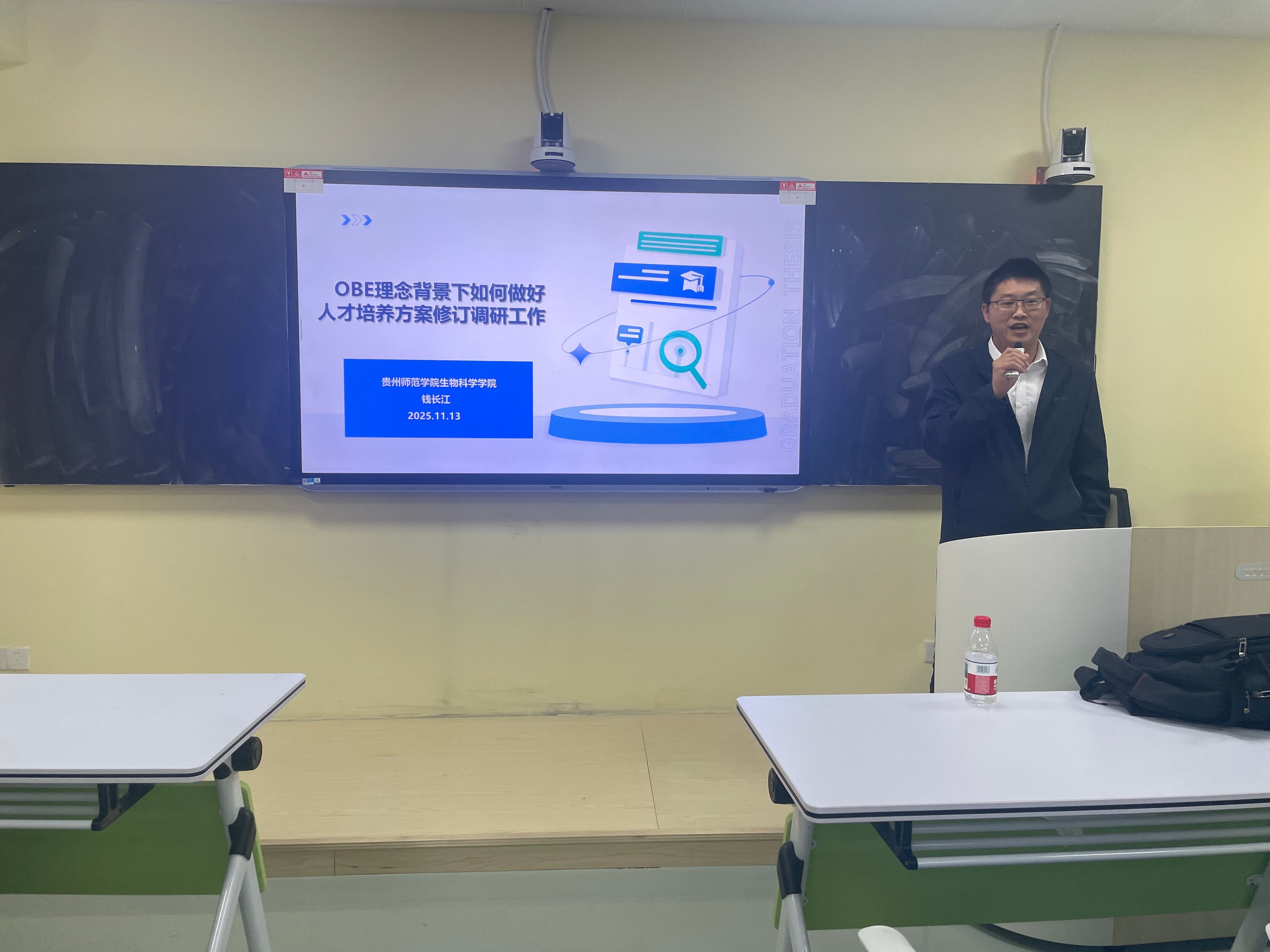 会上,钱长江教授围绕“OBE理念背景下如何做好人才培养方案修订调研工作”,系统阐述了调研工作的重要性和实施路径。他强调,调研是人才培养方案修订的关键依据,必须紧扣OBE理念的三大核心——学生中心、产出导向和持续改进。钱教授结合贵州师范学院的实践经验,详细介绍了调研对象的选择标准(需覆盖用人单位、毕业生、在校生及行业专家等利益相关方)、调研问卷的设计要点以及调研数据的分析方法,并指出调研报告应直接支撑培养目标的合理性评价与持续改进机制。会后,参会人员就调研实施中的具体问题展开了积极交流。