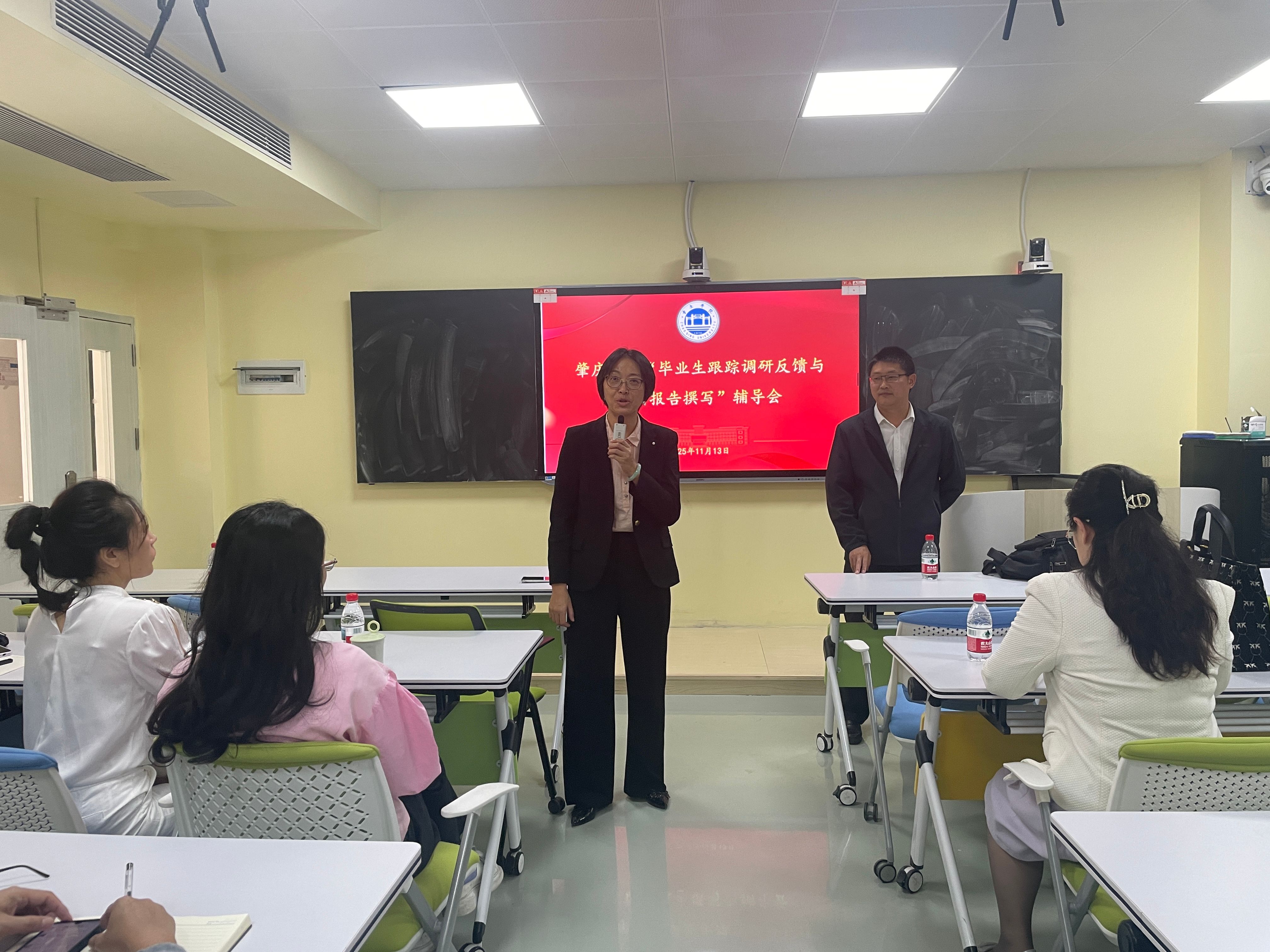 为扎实推进2026年师范类专业认证申请工作,11月13日下午,教学质量监测与评估中心邀请了贵州师范学院钱长江教授作《毕业生跟踪调研与调研报告撰写》的专题讲座。教育科学学院、体育与健康学院、音乐学院、美术学院、设计学院等二级学院的学院领导、专业负责人及骨干教师参会。教学质量监测与评估中心主任李佩环主持会议。